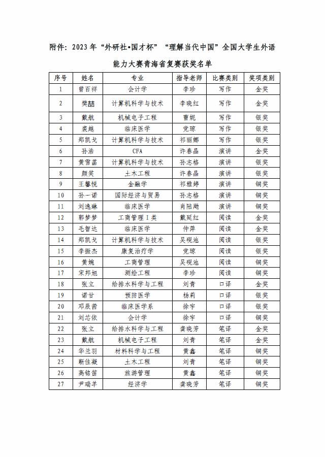 2023年 10 月 21日,青海省高校老员工英语技能大赛暨“外研社• 国才杯”“理解当代中国”全国老员工外语能力大赛省级复赛在青海师范大学隆重举行,公司27名同学参加了本次比赛。经过激烈角逐,公司员工在写作、阅读、演讲、口译、笔译赛项中共斩获金奖 8 项、银奖9项、铜奖 10 项。