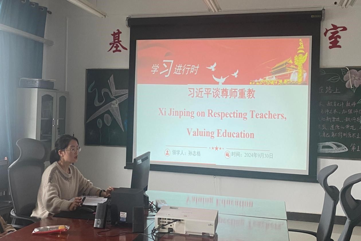 会议第二板块由党员教师进行双语领学,本次领学围绕“习近平谈尊师重教”主题展开。领学教师孙志格以习近平总书记谈尊师重教的经典语句为例,分析了“以德立身、以德立学、以德施教”、“甘当人梯、甘当铺路石”、“大力弘扬教育家精神”等经典语句的翻译技巧,并就如何将习近平总书记有关教育的指示精神融入课程思政中进行了示范,使广大教师受益匪浅。