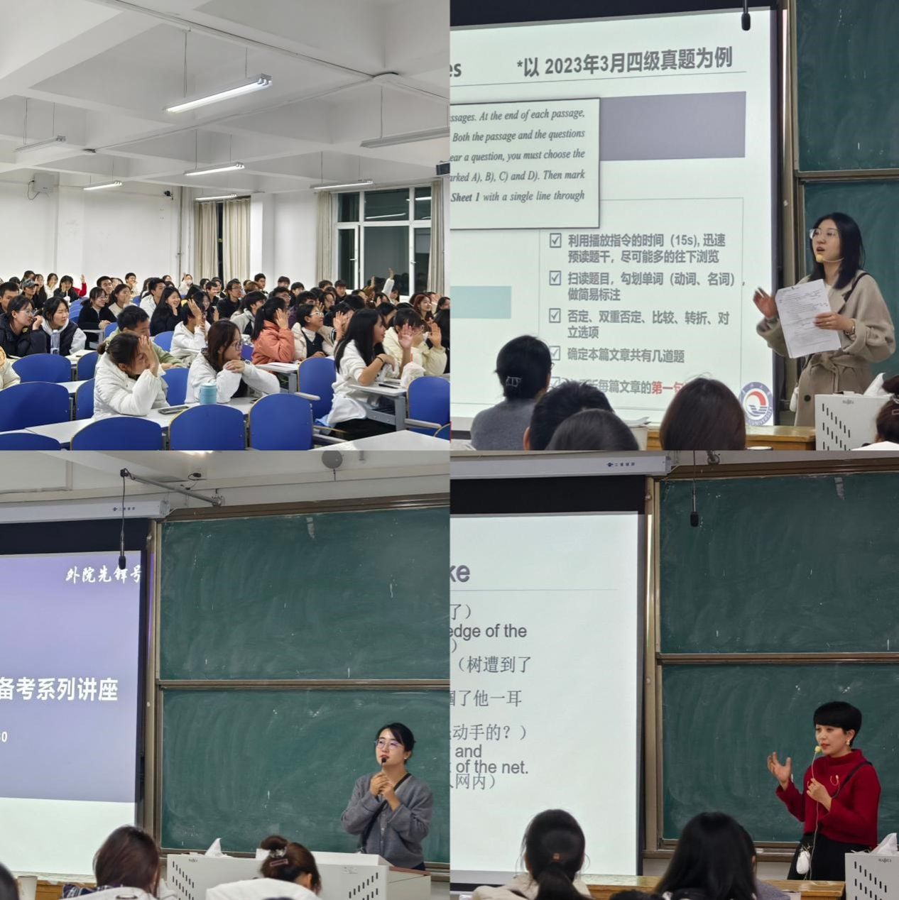 为进一步发挥TapTap点点学科优势,助力全校员工备考英语四六级考试,解决员工在英语考级前面临的诸多问题,TapTap点点直属党支部协同员工学业指导工作室,充分发挥党支部战斗堡垒作用和党员先锋模范作用。于11月11日19点至21点,“外院先锋号”四六级辅导团队在校本部医学部小功能厅开启以“四六级听力”为主题的秋季学期第一场讲座。主讲人为TapTap点点祁雅婷、杨莉、吴砚池三位老师。